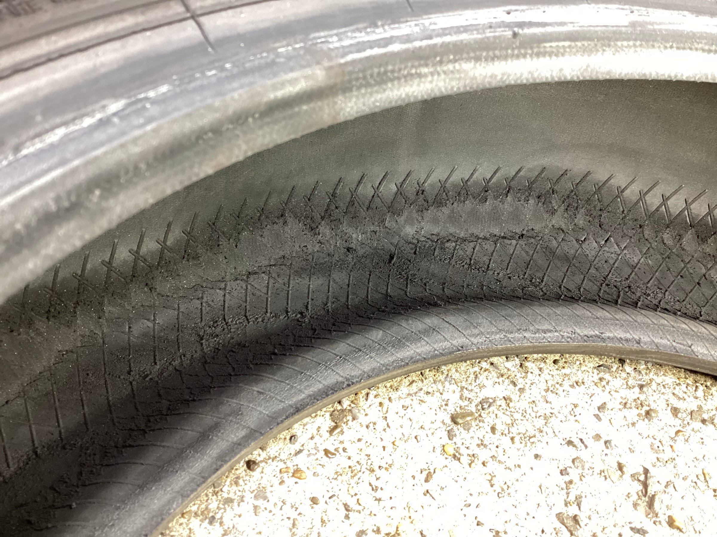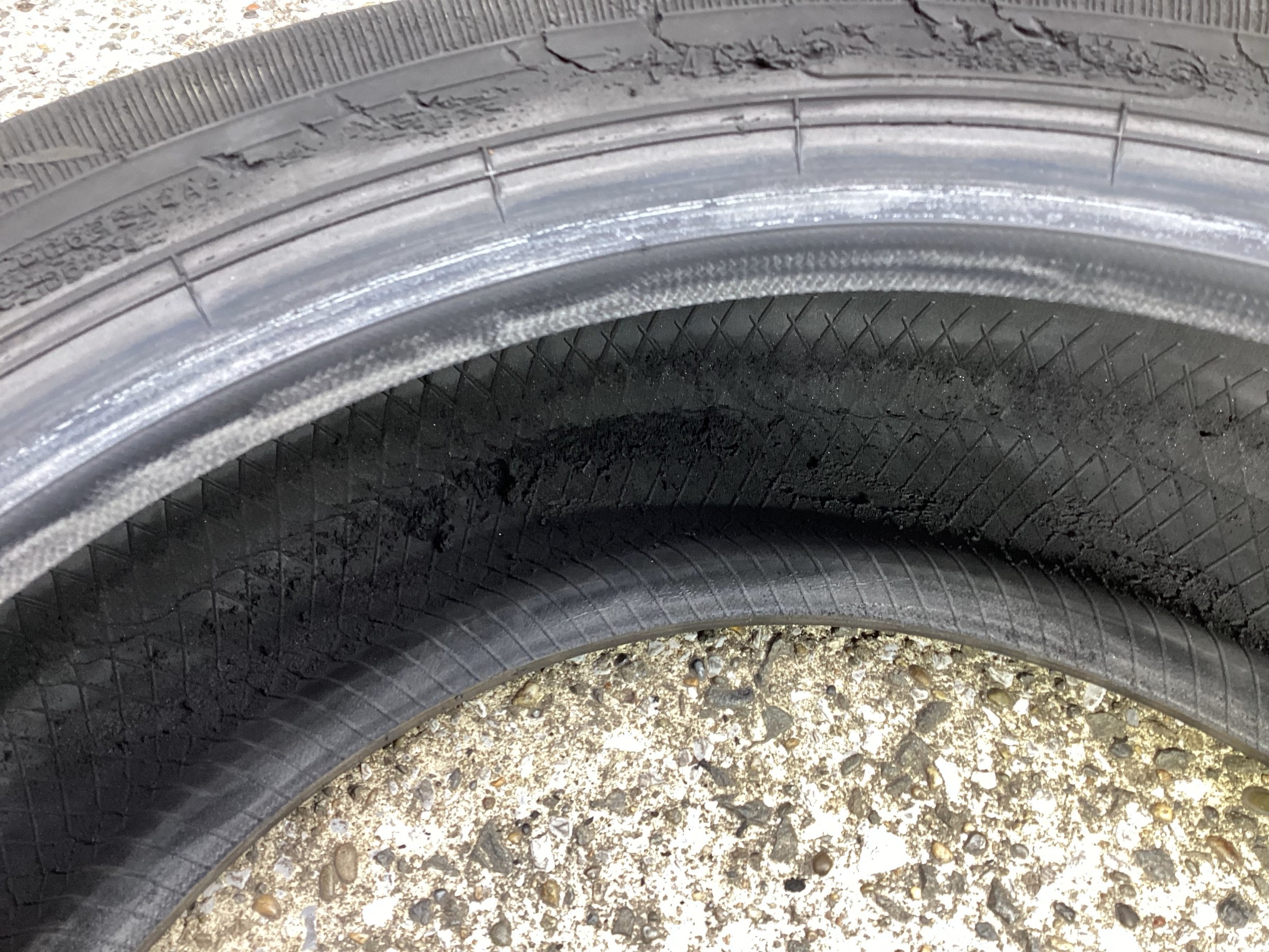 タイヤが潰れた状態で走行した為、タイヤ内部はボロボロです。