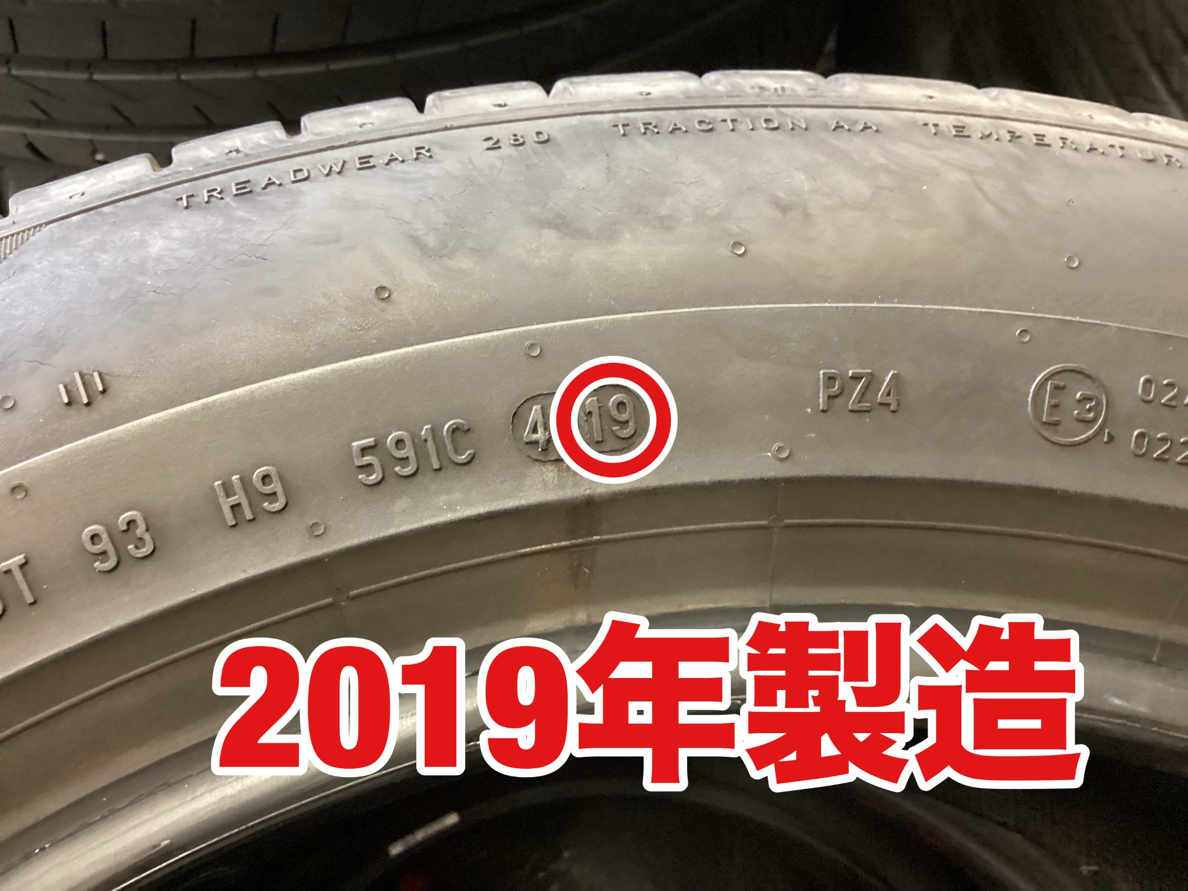 下2ケタが製造年を表しこのタイヤは2019年製になります。