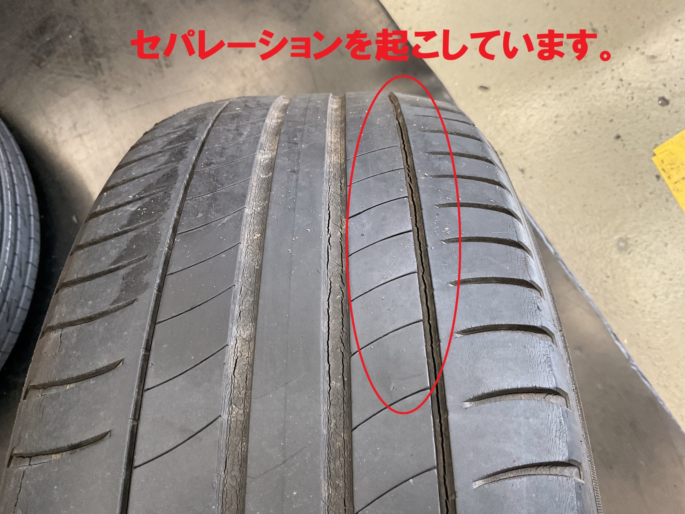 セパレーションとは、タイヤ内部でゴムとコード層が剥離している状態です。
