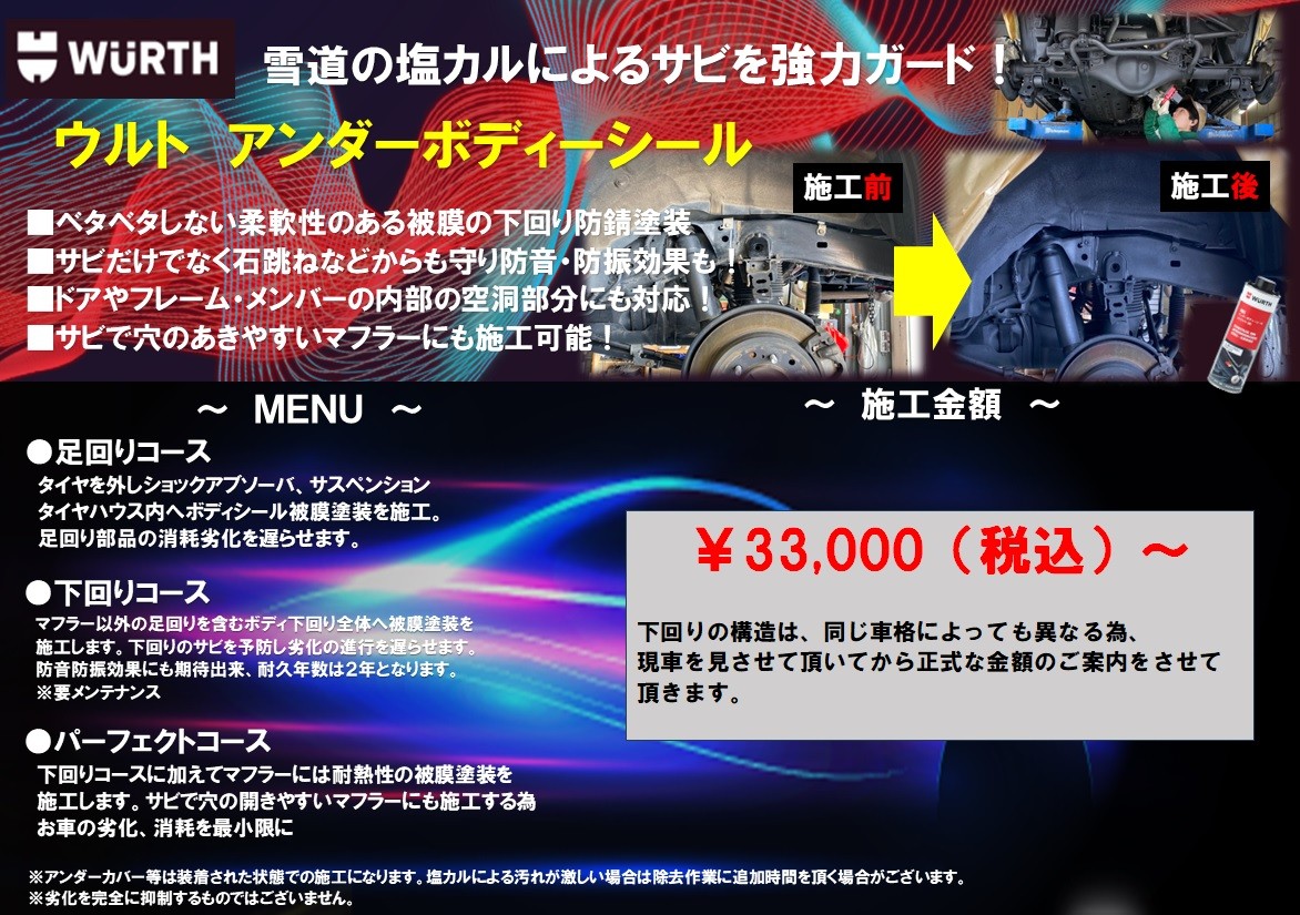 スタッドレスタイヤお履き替え時に、防錆アンダーコートをお勧めしております。