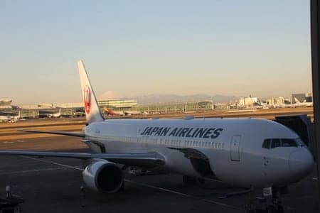 写真1・行きの羽田空港で飛行機越しに富士山!!