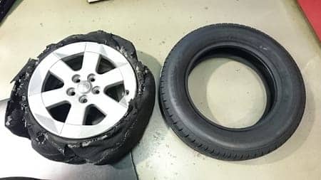 タイヤの溝が減って車重に耐えきれなくなり、遂にバーストしてしまったタイヤ。