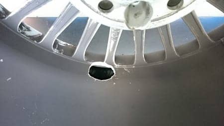 釘など踏んで若干ホイールに傷が付いてしまったようなケースは時折見かけますが、ここまで大穴が空くケース見たのは初めてでした。