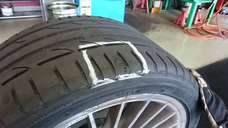 タイヤのショルダー部分に異物が刺さっていた様で、タイヤ交換の必要がある・・・と思ってホイールを見てみますと、恐ろしい事になっていました。