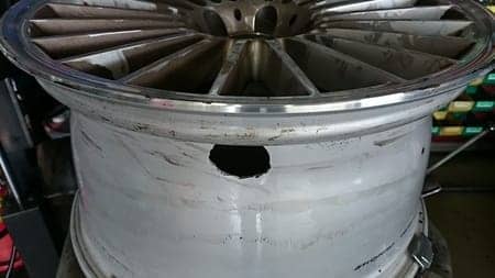 お客様はホイールに穴が空いている事には気が付かず、高速道路上でこのようになったそうで・・・。