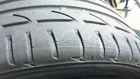前回の交換から5年を迎えているジャガーですが・・・溝はまだまだ残っていますが、経年劣化によってかなりひび割れを起こしています。