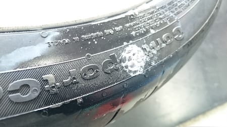 タイヤを確認すると、内側のサイドウォールにカット傷がありました。