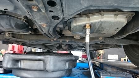 当店では専用アダプターを用いる事により、車体下のATFオイルパンにあるチェックボルトからATFの交換が可能です。