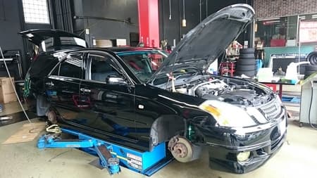 当店で先日ホイールセットをご購入頂いたお客様のブリットへ、本日TEINの車高調を取り付け致しました。