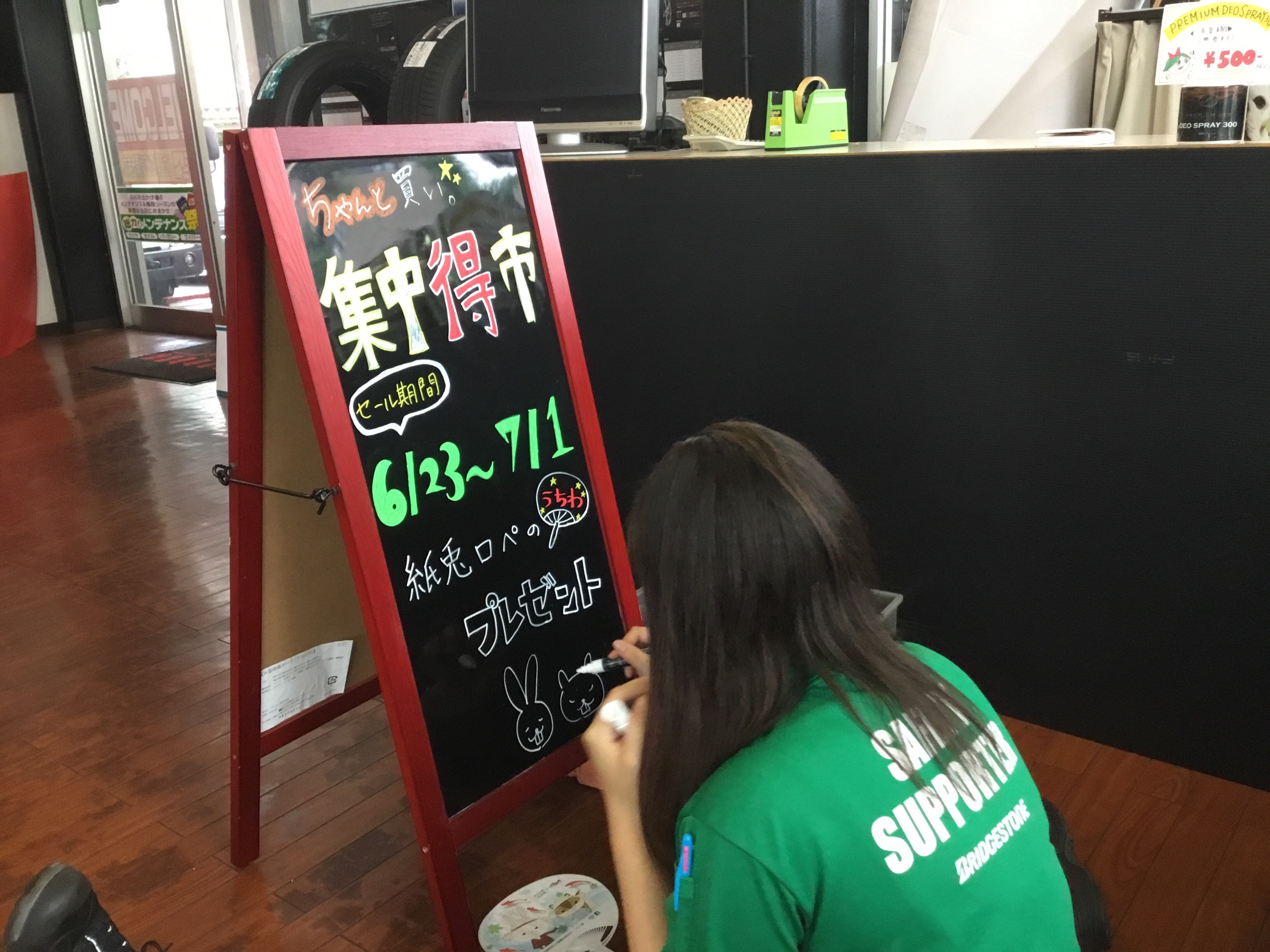 夏フェスがはっじま〜るよ〜〜٩( ᐛ )و ポスト 2018年6月18日 あっっっす!!! 6/23~7/1で夏のSALEが始まります(`・∀・´) お買い得な商品を多数、取り揃えております(*^^*) タイヤ点検、メンテナンス点検、無料にて承っております(*゚∀゚*) ご予約不要なのでお気軽にお越しください(*´꒳`*) 看板作成中…_(:3」z)_ 夏フェスぜひお越しください(`・ω・´) 担当:もぐもぐ&ケラケラ
