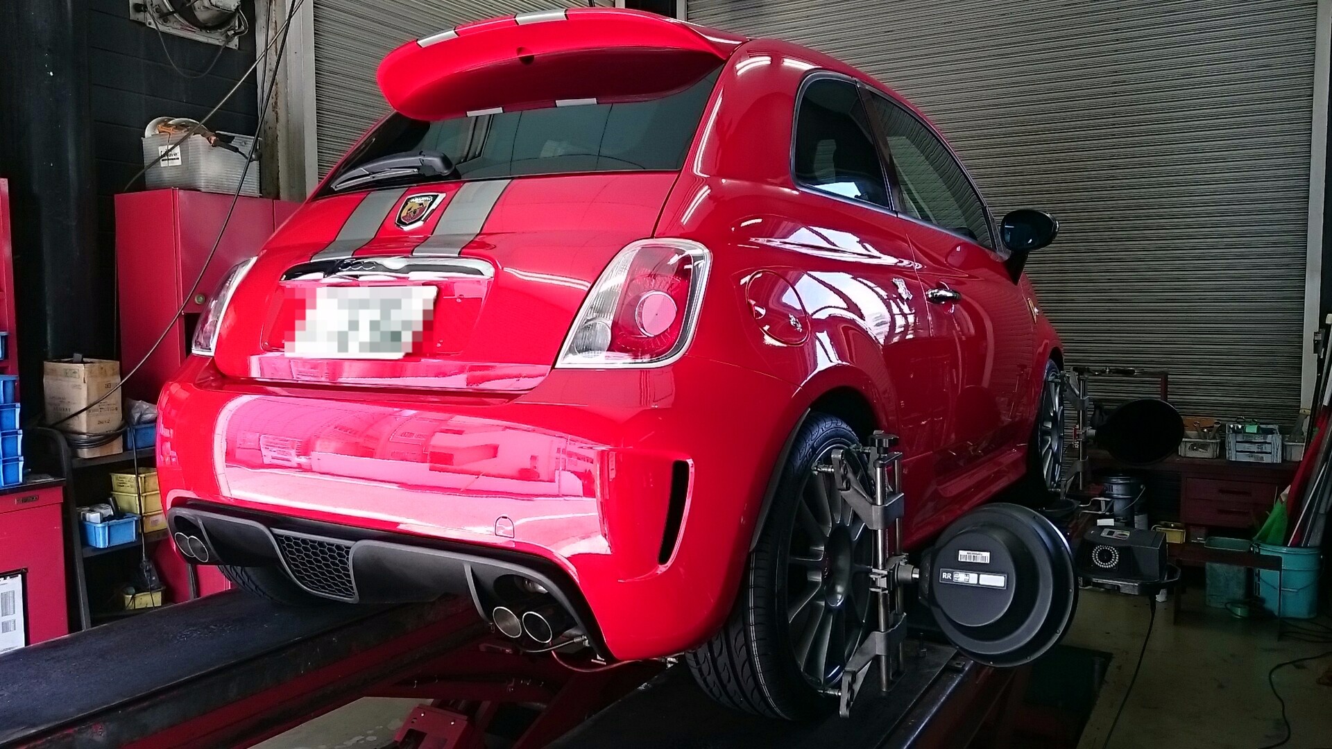 アバルト500 フェラーリディーラーズエディションのアライメント調整です。