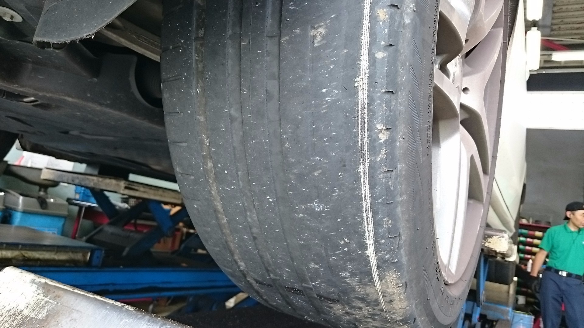 元々装着されていたタイヤはご覧のように偏磨耗を起こしており、外側だけワイヤーが出かかっておりました。