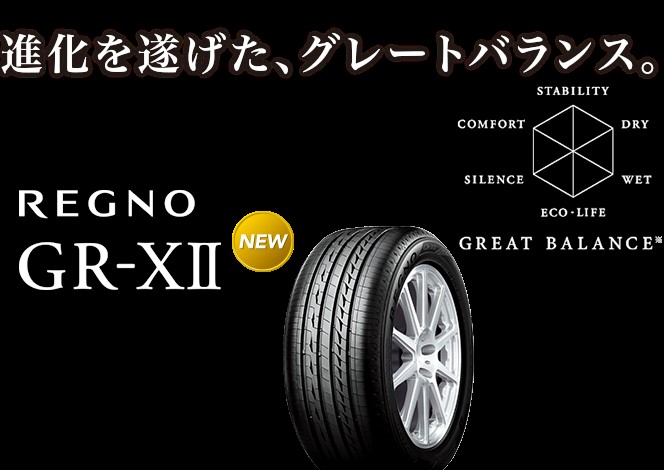ブリヂストンの看板商品の一つである「REGNO(レグノ)」が一部サイズで新しくなりました。レグノのコンセプトである静粛性、乗り心地、運動性能などタイヤに求められる諸性能を高次元でバランスさせたプレミアムブランドです。発売サイズは68サイズです。「REGNO」は、1981年の発売以来、静粛性や乗り心地、運動性能などを高次元でバランスさせたブリヂストンを代表するブランドのひとつとして、多くのお客様にご好評いただいてきました。今回発売する「REGNO GR-XⅡ」は、滑らかな路面から荒れた路面まで、様々な路面でのノイズ抑制を当社従来品に対して更に進化させるとともに、「3Dノイズ抑制グルーブ」と「シークレットグルーブ」を組み合わせた新しいトレッドパタン技術を採用することで、通常はタイヤの摩耗度に比例して大きくなるノイズを前作から低減しています。これにより、新品時・摩耗時ともに上質な静粛性を実現しています。更に、路面との接地形状を最適化することで、段差を乗り越える際の衝撃を従来比5%低減するとともに、ブリヂストンの独自技術「ULTIMAT EYE™(アルティメット アイ)」を駆使し、非対称形状・非対称パタンを採用することで、好評だった従来品同等の高い操縦安定性と直進安定性を確保しつつ、優雅な乗り心地と高い運動性能を両立しています。また、「ナノプロ・テック™」によるゴムの進化とトレッド形状の最適化により、従来品と比べて転がり抵抗を14%低減、摩耗寿命を6%向上しています。「REGNO」の新たなキーメッセージとして、「"REGNO FEELING"~手のひら一枚分に込められた技術が、圧倒的なパフォーマンスを生み出す~」を掲げてます。「GREAT BALANCE」の名の通り、7つの性能を高次元でバランスさせた「REGNO」を、より多くのお客様にご愛用いただきたいと考えております。