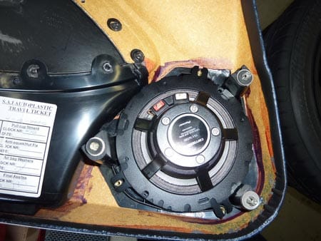 このクルマは通常鉄板側にインストールされているスピーカーがドアパネル側についてるのでいささか低音が出ません。