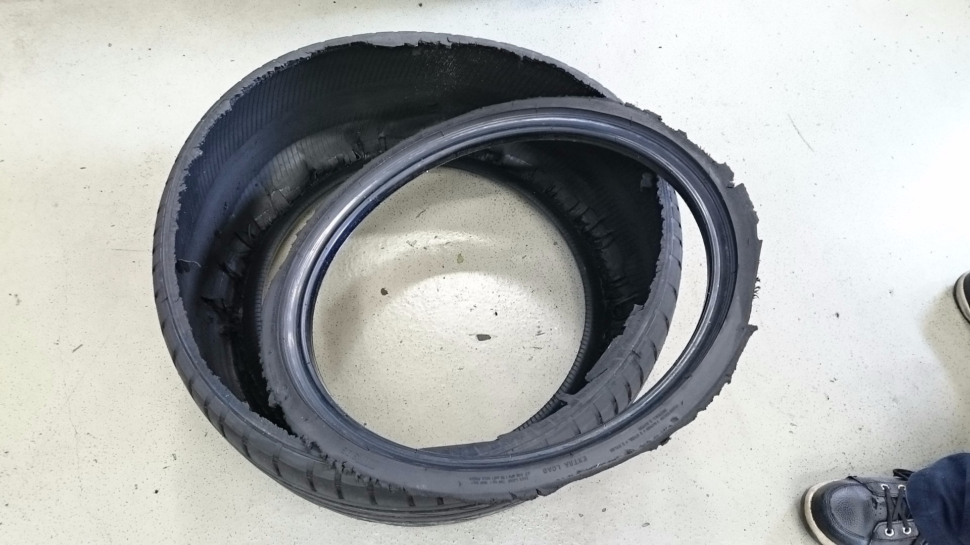 取り外したタイヤはもはやバーストしてシャンプーハットのようになっていました(怖)