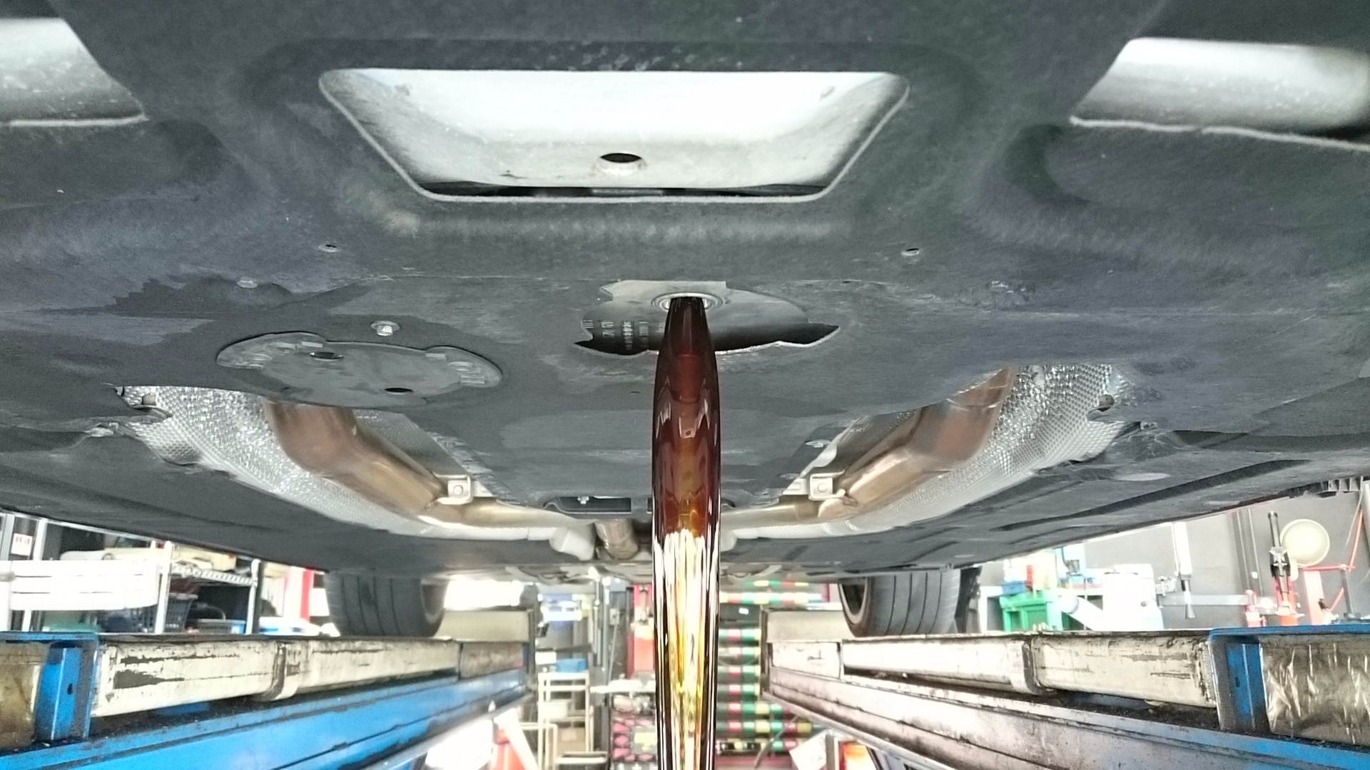最近のBMWはレベルケージがなくモニターによる油量確認となりますので、下抜きが基本となります。