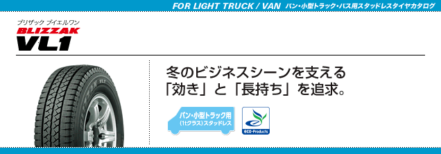 商用車を中心にご使用頂いているバン・小型トラック用スタッドレスタイヤとなります。「BLIZZAK VL1」は、経済性を求めるお客様のニーズにお応えするため、摩耗ライフ性能を従来品(BLIZZAK REVO969)対比20%向上※1させています。主に、4ナンバ-車への装着はこちらになります。