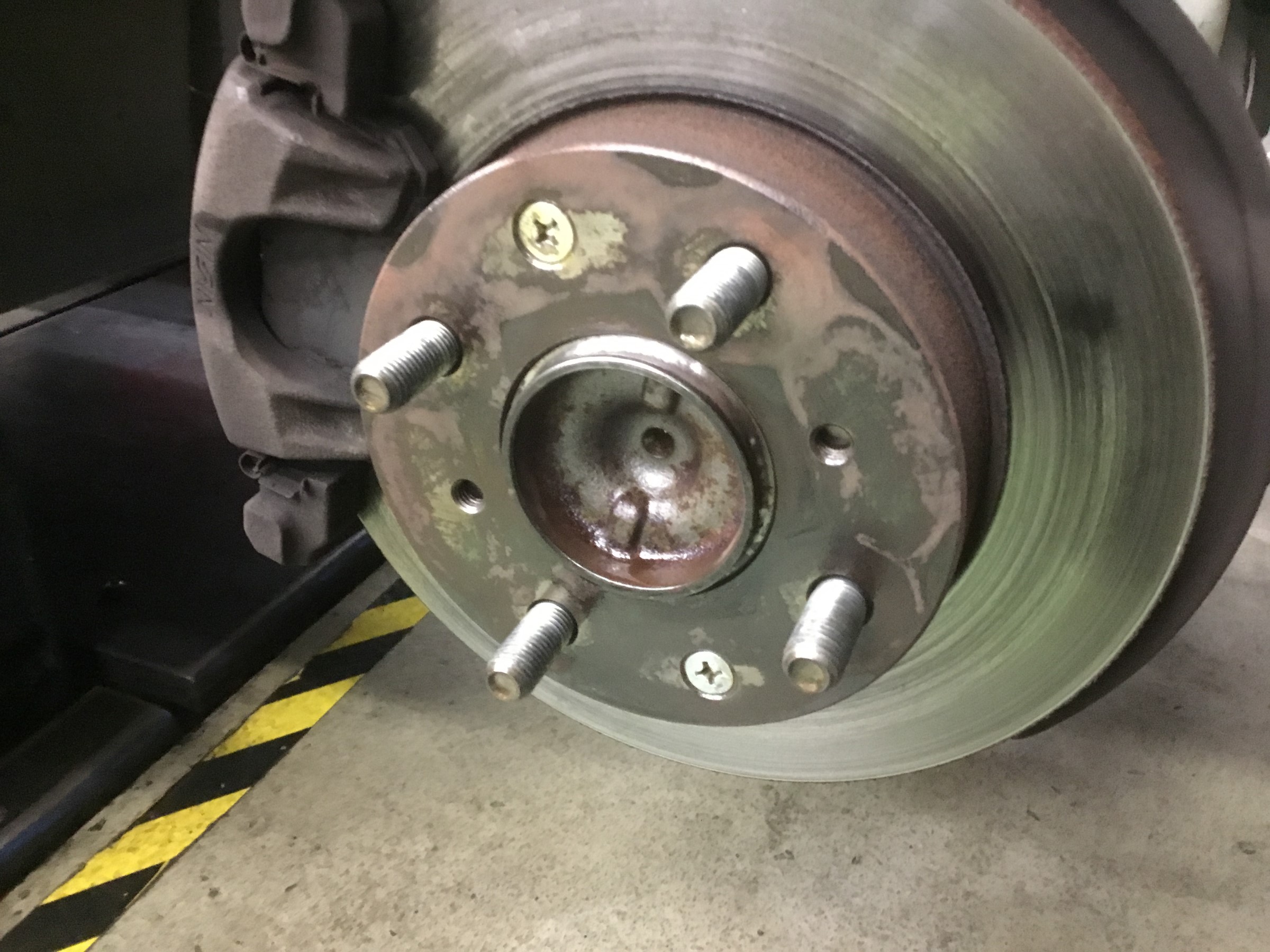 ついでに、軽バンや商用車に多いですが、ホイールとブレーキブレーキローターの合せ面(ハブ)や下回りなど、結構、錆ていることが見受けられます。こちらのアクティーもご多分に漏れず錆が発生していましたので、タイヤ交換と一緒に防錆コーティングも施工させていただきました。