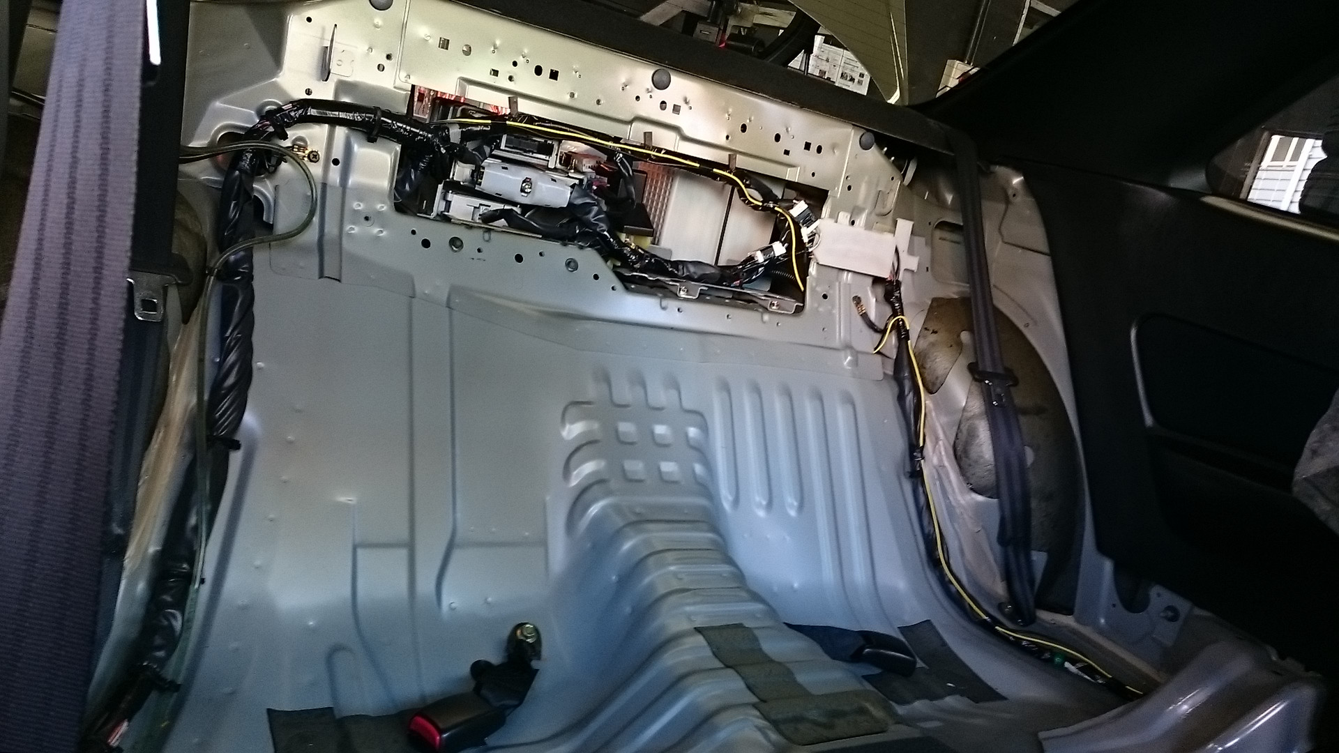 バックカメラの配線を通す為、リアシートも全て取り外しです。