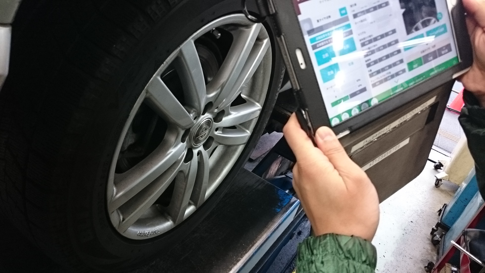 タブレット端末に残溝などのデータを記録し、今シーズンの役目を終えたスタッドレスタイヤを取り外します。
