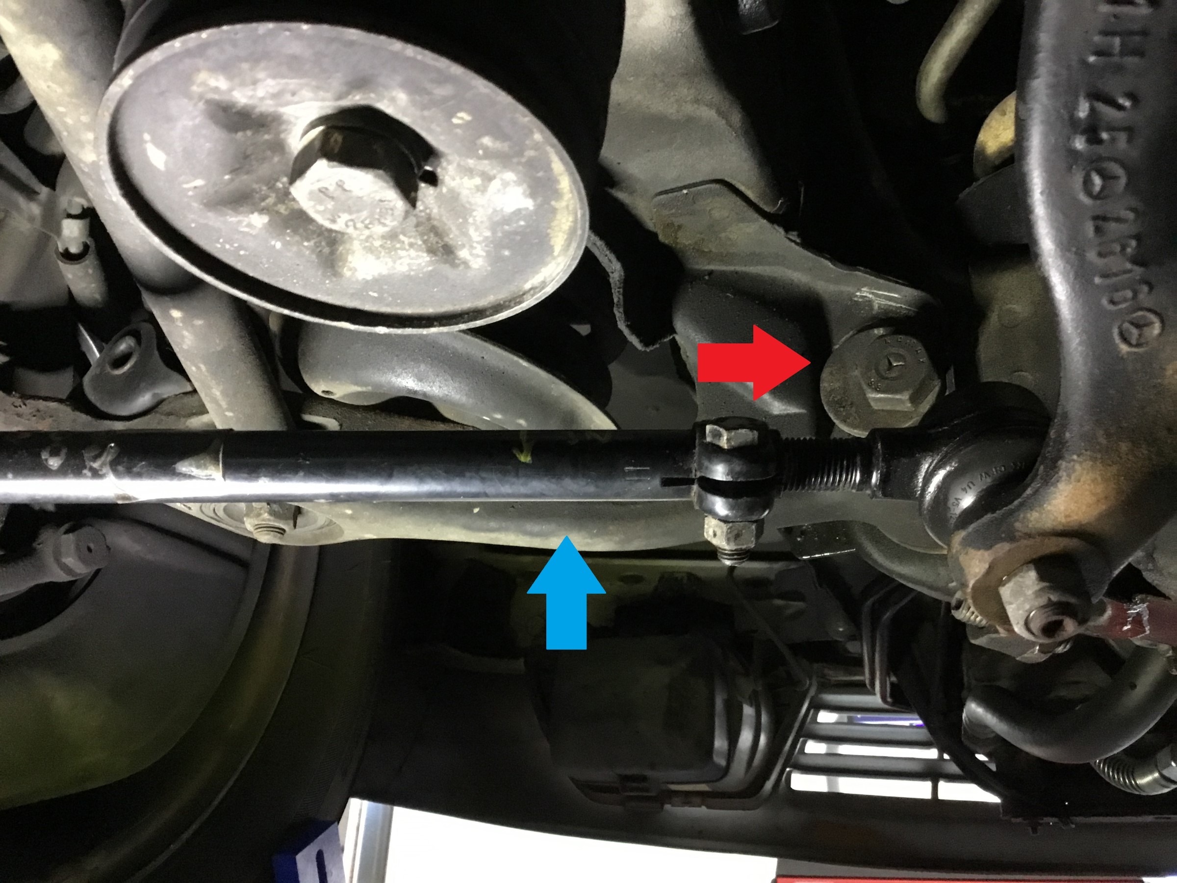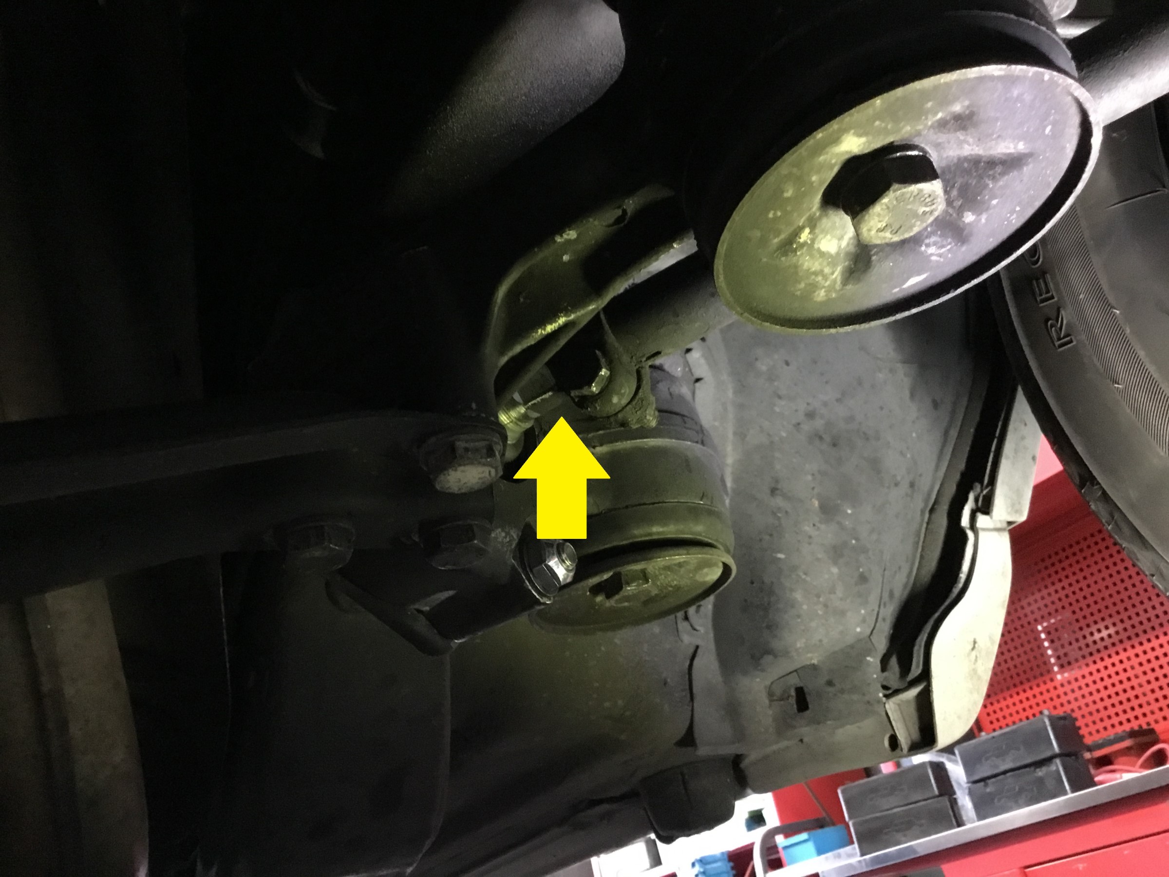 少しほかの車種と違うのはキャスター調整が黄矢印のようにタイロッドのようになっていますので、これを伸ばしたり縮めたりして調整します。