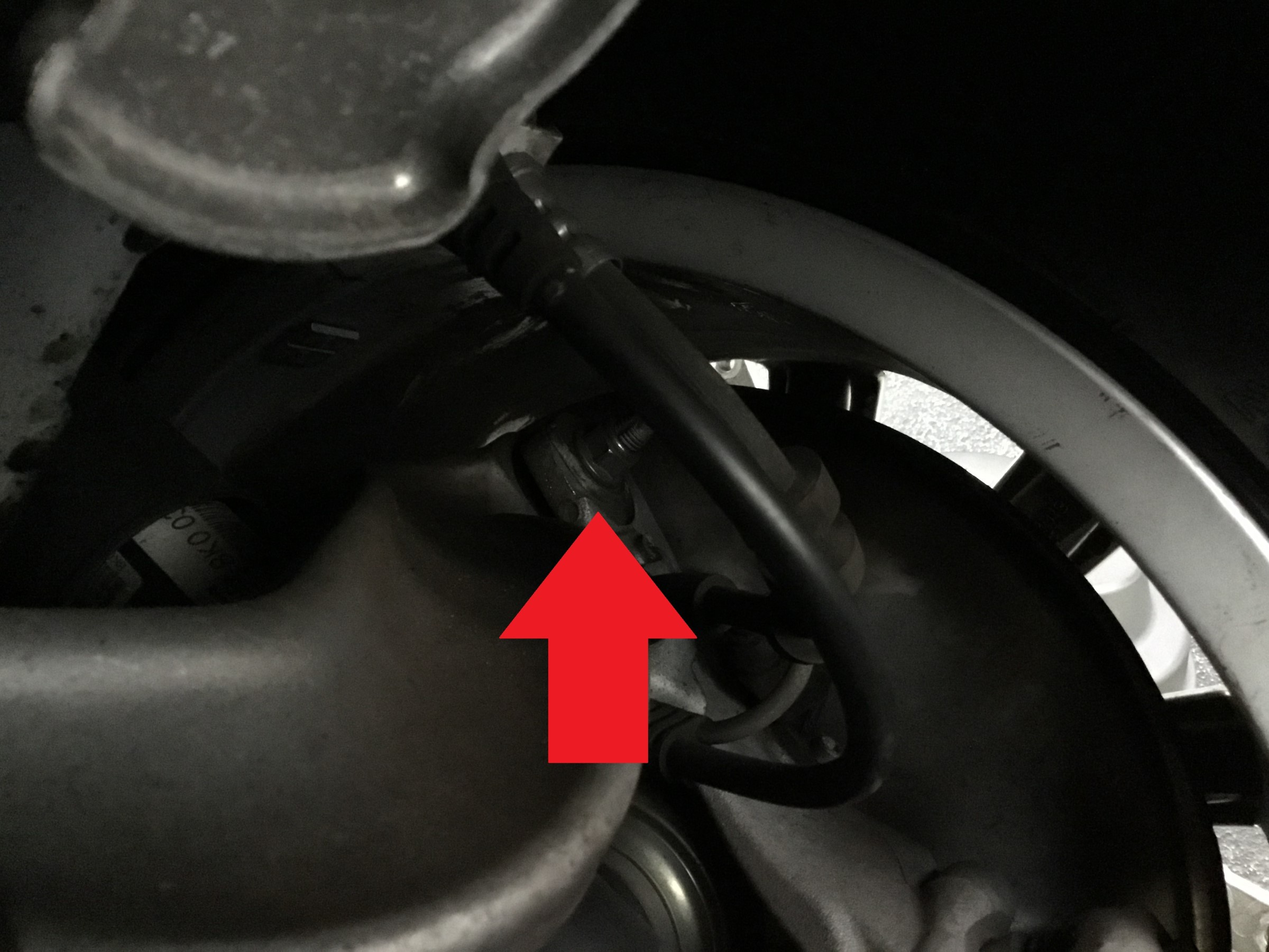 リアのキャンバーは上の写真の赤矢印にあるカムボルトを回して調整しますが、ナックルの上側にカムボルトがあり、周りのホースやハーネス、アームにホイール等邪魔なものがかなりあります。18インチ以上になってくるとホイール内側の内径が大きくなるためスムーズに工具が入ってくれてやりやすいのですが、17インチ以下になってくるとホイールの中に納まりつつホース類やアームに当たらない工具選びが必要になってきます。工具がない場合は一度リフトアップしてホイールを外し、多少カムボルトを緩めてから着地させ調整してからある程度締め込み、またリフトアップして締め付ける方法もあります。