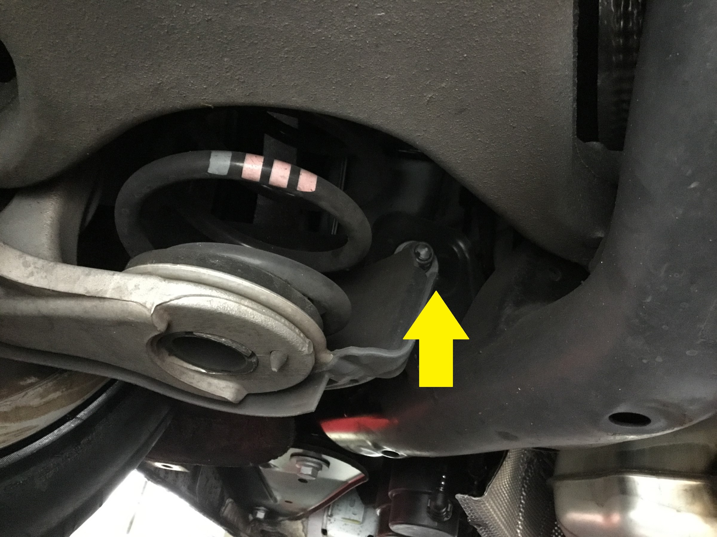 リアのトー調整はスプリングの奥にあるカムボルトを回して行います。こちらは緩めたり締めたりは比較的簡単にできますが、調整はボルトの頭がしたからでは全く見えない位置にありますので、手探りで探しながら工具を入れて調整します。