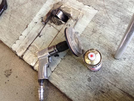 ピカールを少量塗り、布地のついたバフをドリルに着けて