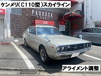 本日は超レア車、、、いや希少車のスカイラインの作業です。 タイヤをREGNO GR-XⅡに交換してアライメント調整を実施です。 今回は国産旧車の匠である土方スタッフが担当しました。 はい、違いの分かる漢ですので、しっかりケンメリを堪能して作業をしておりました。 懸念事項であるタイヤの片減りも...