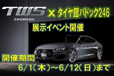 ☆TWSホイール展示会開催☆6/1(木)~6/12(日)TWSホイール展示会開催いたします。なかなかお目にかかれないTWSさんのホイールを見れるチャンスです!!セール期間中、ご商談、もしくはご成約特典も準備してお待ちしております。特典には数に限りがございますのでご了承ください。