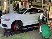 小粒?なQ3の中で最もホットなモデル RS Q3のタイヤ交換です。 ボディは小型ながら20インチを装着しています。 それもその筈ブレーキは非常に大きく強力なものとなっています。 そのパワーを受け止めるべくポテンザ S007Aを装着です。 スポークの中に見え隠れするキャリパーがカッコいいですね。 ご...