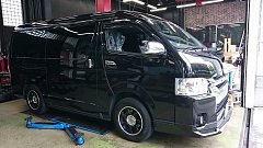 200系ハイエース、ワゴンGLのタイヤ交換です。 インチアップして17インチを装着しています・・・ が、当社ではハイエースならびにキャラバンのインチアップ用タイヤもラインナップされています。 ブリヂストン GL-R! サイドのデザインが好評です。