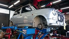 つい最近購入されたと言うMGB。 初期モデルは50年以上前になるモデルで、最終モデルであっても40年近く前になります。 ローバーミニにも通づるいかにもブリティッシュな内装が良いですね。 車体が軽すぎるのでジャッキアップにも気を使います(苦笑)
