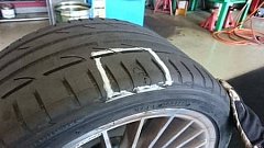 ピット入庫前ハンドルに違和感を覚え、取り外したタイヤを見ると・・・。 タイヤの一部が盛り上がってしまっています。 これは人間で言うところの内出血にあたり、タイヤ内部のコードが切れて中の空気圧によって圧迫されている状態なのでかなり危険です。 一歩遅かったらバーストしてしまう可能性も...