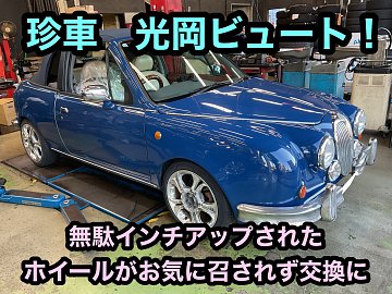 珍しい車の入庫です。 日産マーチベースで長年造り続けられてきた光岡ビュートになります。 元々インチアップ装着されていたホイールや乗り心地が気に入らず、 タイヤホイール共に普通のサイズへ戻しての装着です。 SEINとNEWNOのセットです。 個人的に旧車はインチアップしない方が自然ですね。 カ...
