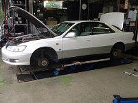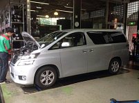以前2本交換をご依頼頂いたお客様。 今日は残りの2本とバッテリーの交換です。 このクルマ、25万キロ以上走られていますが流石にトヨタですね。 V8エンジンは全くもって静かなものです。 交換後は長持ちプランによるアライメントも実行です。