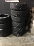 お仕事を終え、廃タイヤとして処理を待つ タイヤ達が積み上がっております。 冬季はお客様のタイヤもお預かりする(有料保管サービス) そんな時期ですので、間違いのないように 廃タイヤとなる物には しるし を付けます。 その際 X印をチョークで記します。 それで、廃タイヤであることを、ダブル...