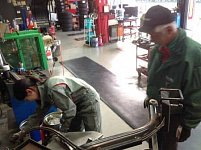 ボルボ940アライメント中 ステアリングのセンター位置を決めるのに、ちょっと悩みます。 ご覧の通りステアリングエアバックのてっぺんとステアリングコラム(軸)のてっぺんが 「平面的」同士であるため、平面部分が一直線にそろうステアリング位置があります。 その平面部分同士が揃う場所でス...