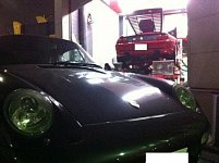 閉店後です。。 この時間にアライメント部屋にはF355ベルリネッタが車高調整とアライメントであがってますね。。←まだ車高調整中。。 しかも不気味な911 993越しです・・・ この2台を明日に持ち越すのはかなり危険です。。 ヘビーな作業であるだけでなく、明日は私(カネサカ)はお休みなのでチリ...