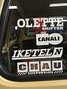 よく見かける ステッカーなのですが、これがまた面白いのでパチリ。 ぱっと見は、 カスタムブランドのロゴステッカーが縦に並んで貼ってあるように見えますが、 実は、、 上から、読んでみると、 オレッテ キャナリ イケテルン チャウ 俺ってかなり(きゃなり)イケてるん ちゃう? ですって!笑 イケ...