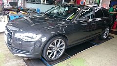 お盆休みに入り、昨日一昨日と多くのお客様がタイヤ交換にいらっしゃいました。 本日もそれに負けじとタイヤ交換です。 のっけからアウディA6、255/35R20! 20インチが当たり前に出るのがパドック246(笑) アライメント調整も致しました。