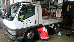 トラックのバッテリー交換です。 24ボルト車ですので当然二個付け。 重いです(笑) はたらく車にこそ定期的なメンテナンスを~。