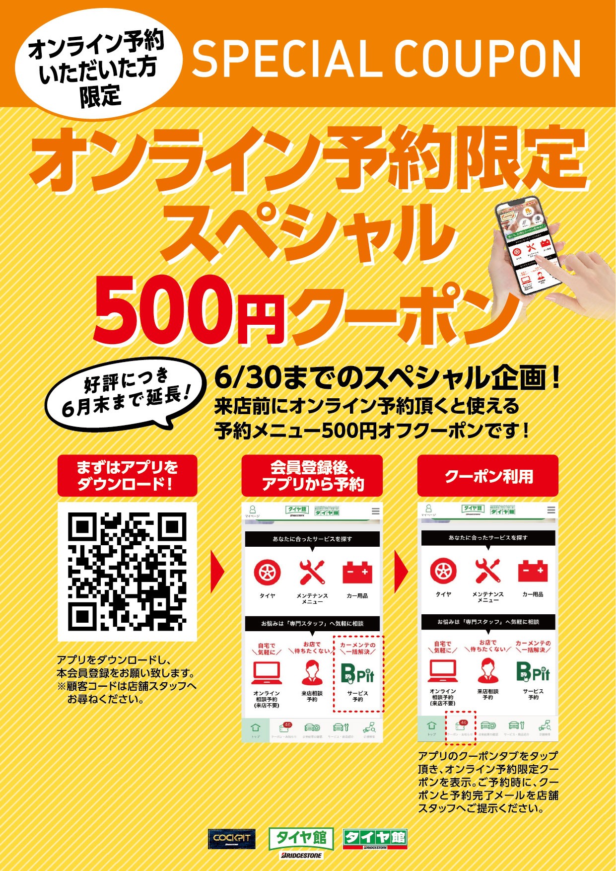 タイヤ館アプリでオンライン予約限定スペシャル500円クーポン配布中!!