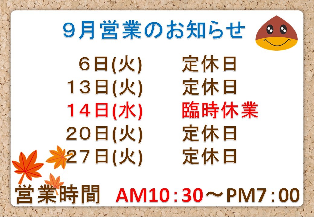 9月の営業のお知らせです!