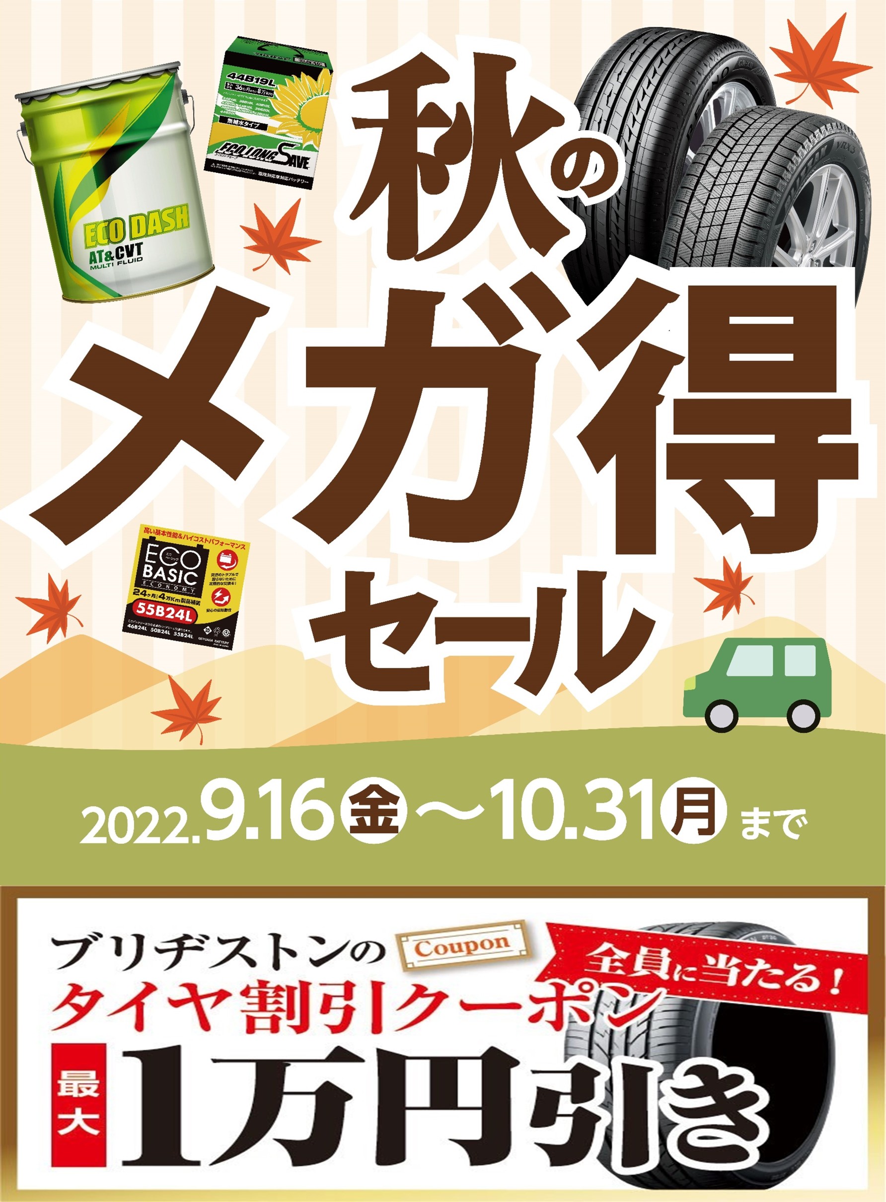只今、タイヤ館栗東では「秋のメガ得セール」開催中!