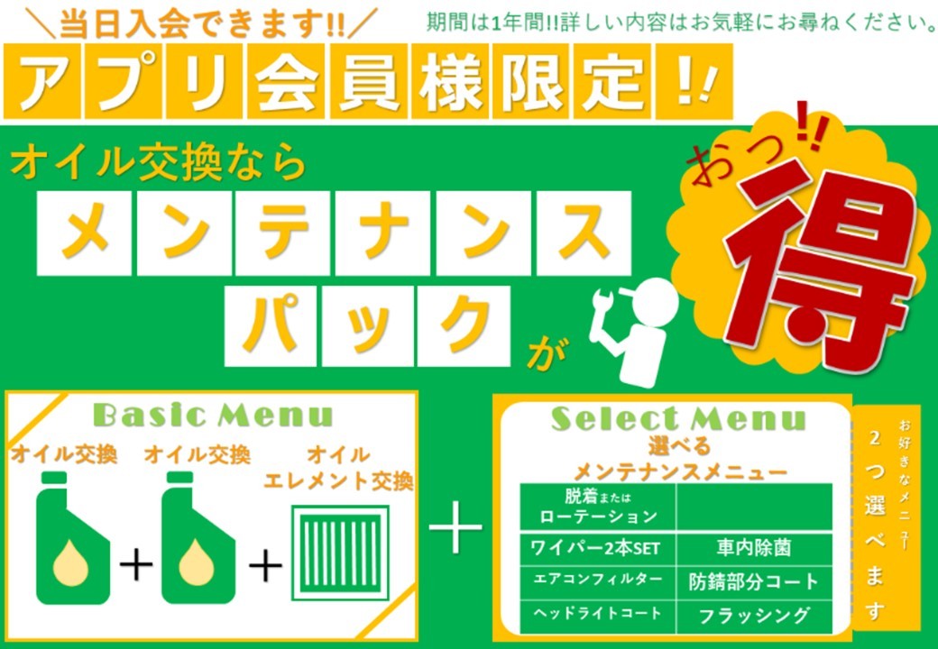 お車のメンテナンスもお得に!! ポスト 2024年8月23日 こんにちは(^^)/ タイヤ館栗東 コテラです(^^♪ お車のメンテナンスって 意外と費用がかかるんですよ(>_<) 定期的なんメンテナンスが大事なんですが タイヤ館では・・・ 「メンテナンスパック」がお得ですよ(^^♪ 選べる・・・ セレクトメニュー(^^♪ 期間は一年間!! 「必要な時に・・・」 「必要な物を・・・」 「お客様のお車の状態に合わせて・・・」 タイヤの履き替えも パックがお得ですよ(^^♪ 詳しくは、スタッフまでお気軽にお尋ね下さい(*^-^*) カテゴリ:オイル関連 その他メンテナンス 商品情報
