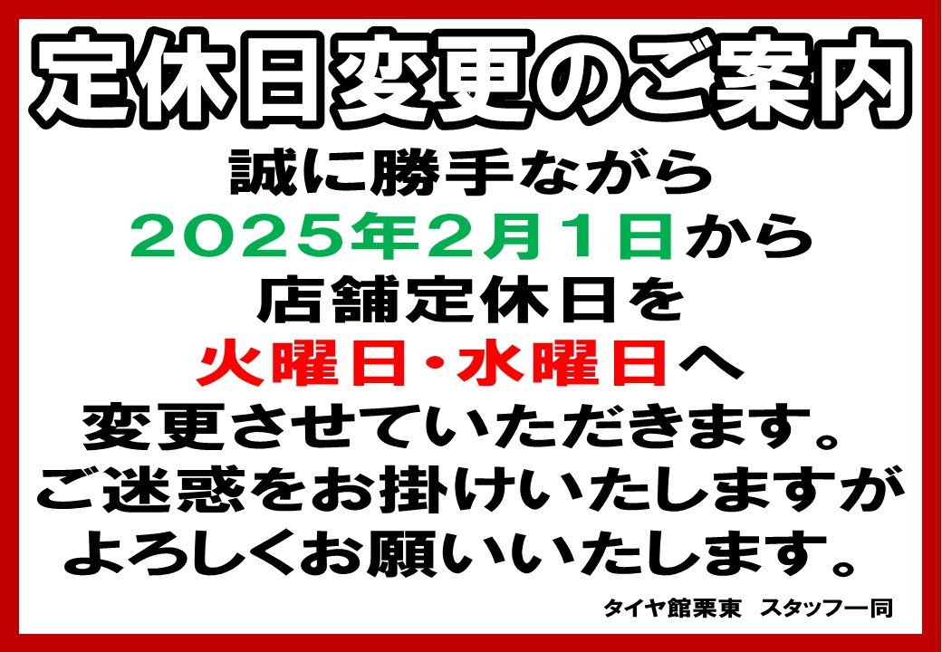 タイヤ館栗東 定休日変更のお知らせ ポスト 2025年1月24日 平素はタイヤ館栗東をご愛顧いただき 誠にありがとうございます。 この度 2025年(令和7年)2月1日より 定休日を毎週火曜日・水曜日に変更させていただきます。 お客様には、大変ご迷惑をお掛けいたしますが 何卒ご理解いただきますよう、お願い申し上げます。 タイヤ館 栗東 住所:520-3041滋賀県栗東市出庭506 電話番号: 077-554-1921 カテゴリ:お知らせ 担当:越智