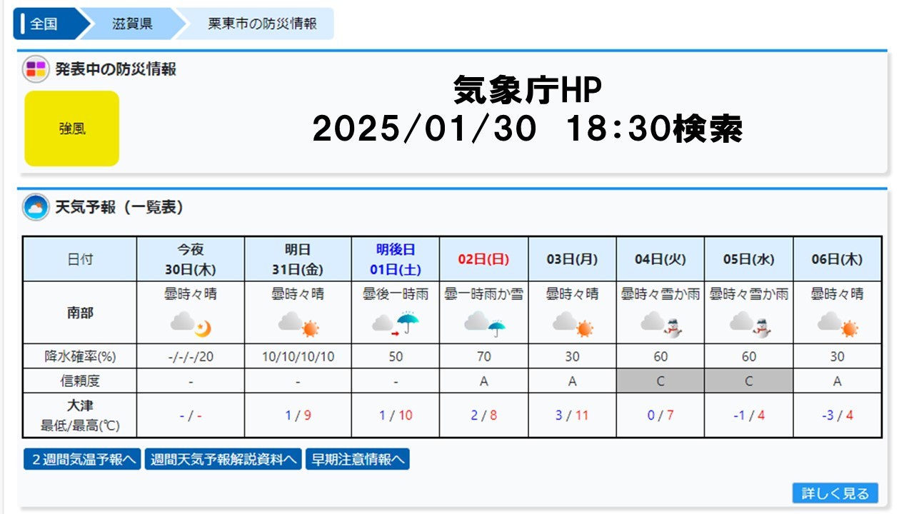気象庁のHPを2025年1月30日18:30にて検索しますと