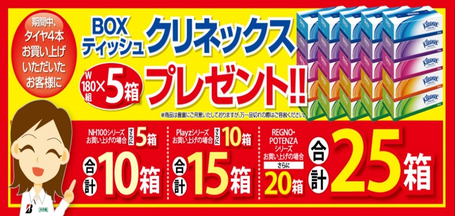 タイヤ4本お買い上げのお客様へクリネックスのBOXティッシュをプレゼント(*>ω<)♪