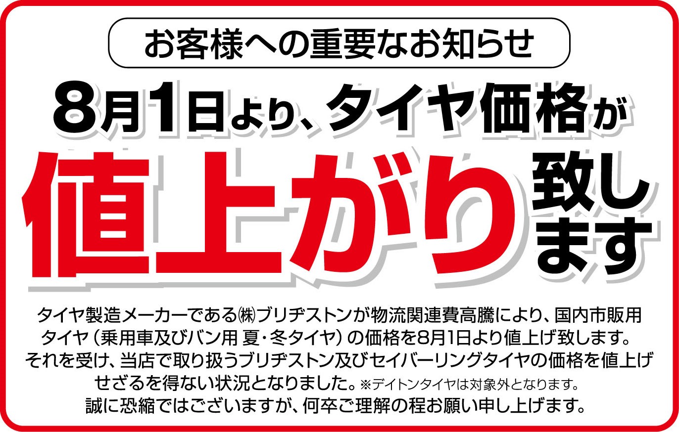 8月 より タイヤの値上がり もありますので